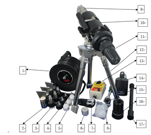 主機箱(A) 1個 配件箱(B) 1個 主機 1臺 三腳架 1個 水壺 1個 線盤 1個 起爆器 1個 電發火彈 10個 彈筒 1個 鏟形切刀彈 3個 錐形有機玻璃彈 3個 圓柱形鋼芯彈 3個 圓錐形鋼芯彈 3個 棘輪扳手 1個 退彈桿 1個 水堵 10個 連接短線 1根 合格證 1個 說明書 1份