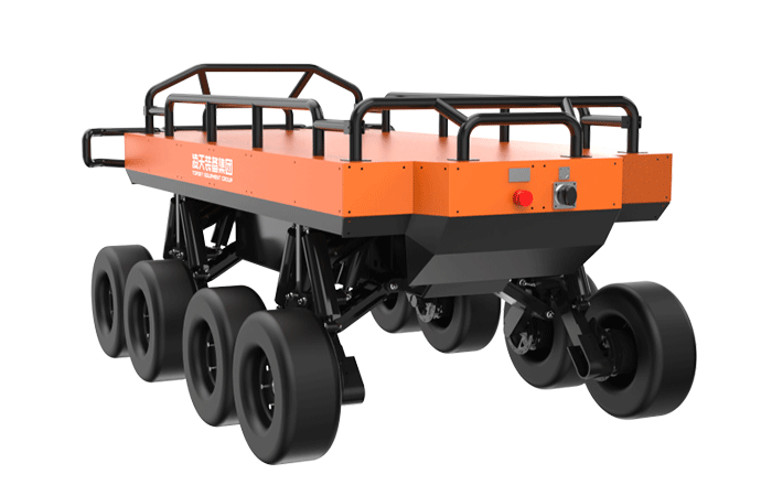 為應對野外山地、叢林、泥濘等非結構化地形,采用8輪與獨立懸掛的輪式底盤,平穩(wěn)適配崎嶇場地,穩(wěn)定穿越 陡坡、臺階、沙石地等,彌補輪式機器人在復雜地形的短板。同時可在 - 20℃至 50℃的寬溫區(qū)間穩(wěn)定作業(yè)。