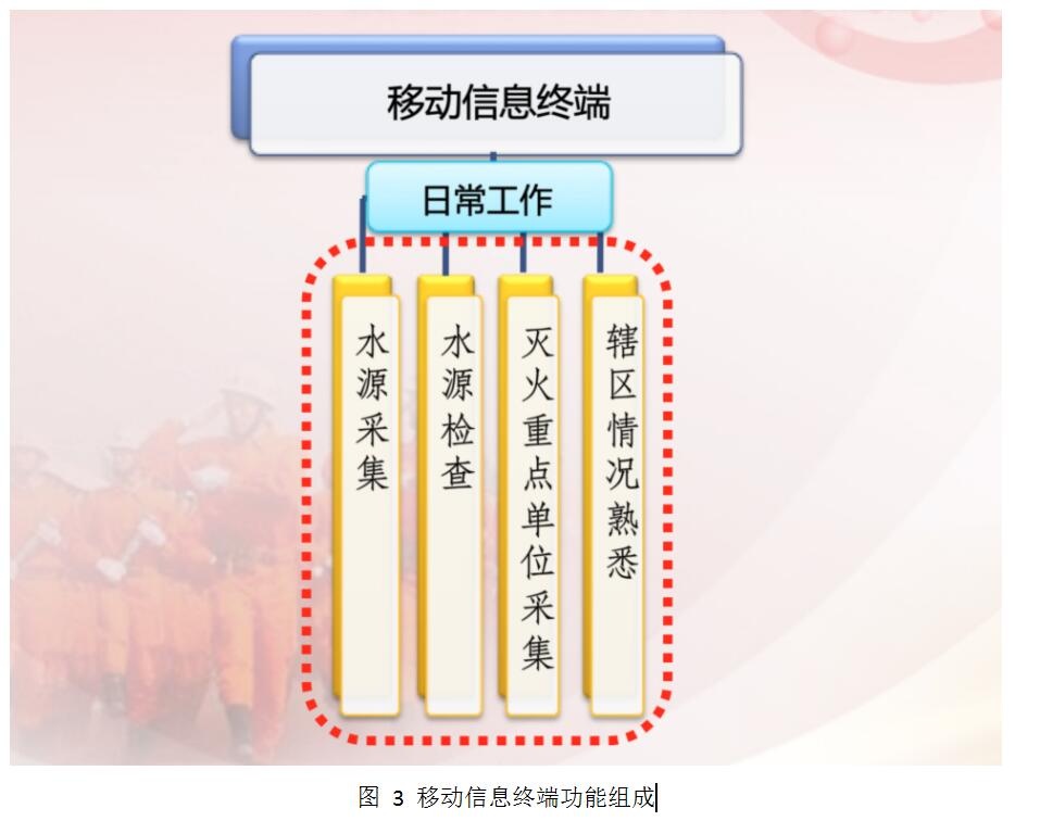 移動信息終端作為日常工作中中隊指揮員、戰士的信息采集工具,主要包括水源采集、水源檢查、滅火重點單位采集以及轄區情況熟悉四部分功能,功能組成如下圖所示: