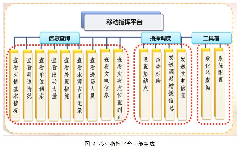 移動指揮平臺作為支隊及以上指揮員輔助指揮與決策的工具,主要包括信息查詢、指揮調度以及工具箱三部分功能。其中信息查詢主要包括查詢案件信息的相關功能,指揮調度主要包括發送指令的相關功能,工具箱包括危化品查詢和系統配置。移動指揮平臺的功能組成如下圖所示: