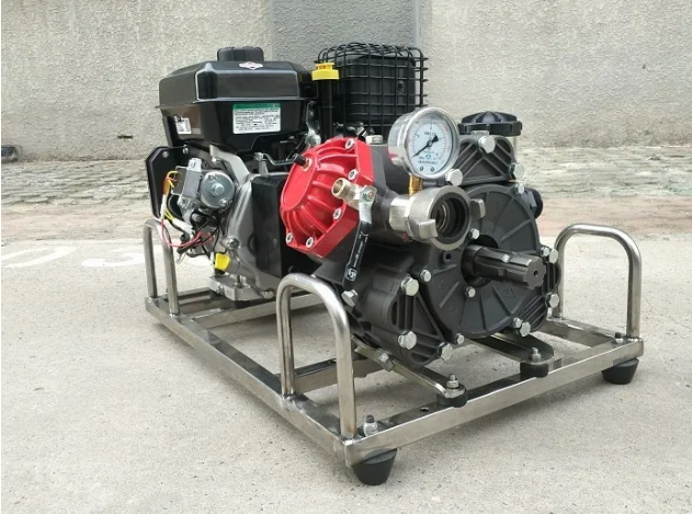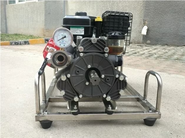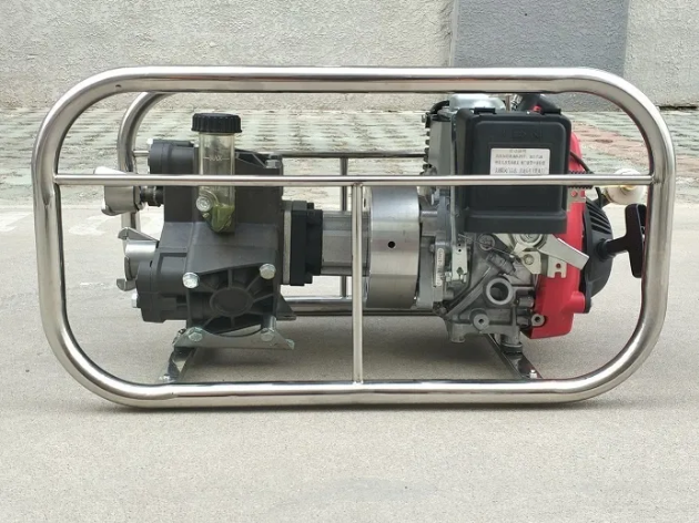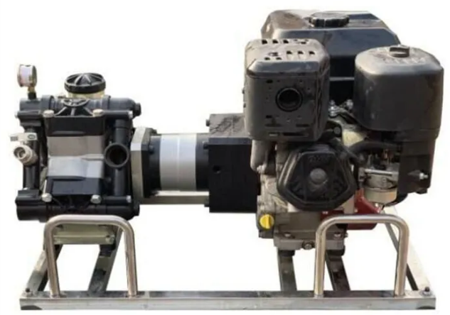 不銹鋼架,便于攜行。泵軸水平布置,減少震動。水泵泵體為柱塞液壓隔膜泵。允許砂石顆粒通過,對水質要求低,對發動機功率損耗小。泵組可在橫向、縱向傾斜達到25°時正常工作。水帶直徑25mm,爆破壓力18MPa,表層滌綸長絲,內襯進口橡膠,高壓森林接口連接。水泵配備的動力裝置為強制風冷四沖程汽油機。我們的行星減速機通過特殊的處理方式,在發動機轉數超過2000轉的情況下,不會削弱發動機的動力,反而有助于發動機的動力,提高水泵的效率。