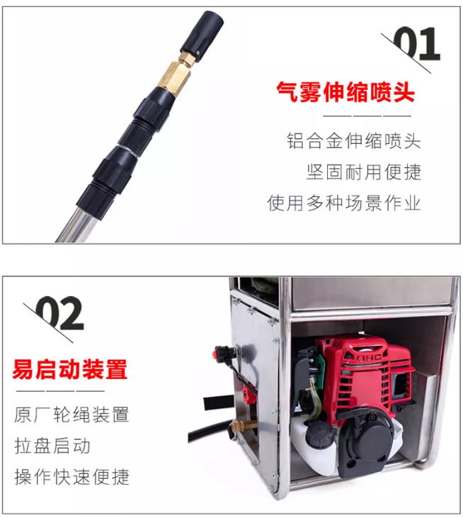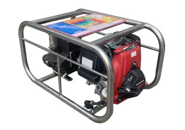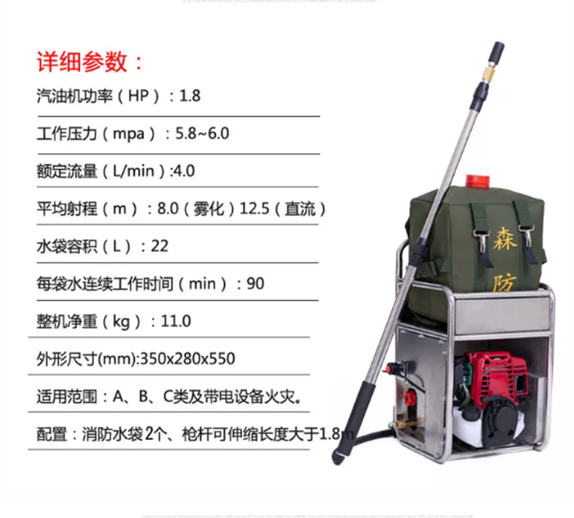 不銹鋼架,便于攜行。泵軸水平布置,減少震動  水泵泵體為柱塞液壓隔膜泵。允許砂石顆粒通過,對水質要求低,對發動機功率損耗小。  泵組可在橫向、縱向傾斜達到25°時正常工作。  水帶直徑40mm,爆破壓力18MPa,表層滌綸長絲,內襯進口橡膠,高壓森林接口連接。  水泵配備的動力裝置為強制風冷四沖程汽油機。
