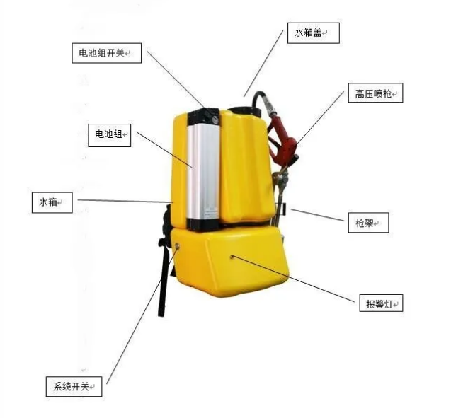 本產品是電機驅動水泵產生一定壓力的水流,通過對水流壓力和流量的控制后,再通過可產生細水霧的專用噴槍噴出進行滅火的裝置。改裝置設置了限壓限流、缺水保護、欠壓提醒等多種保護。系統沒有壓力容器。徹底解決了使用壓力容器的安全隱患。
