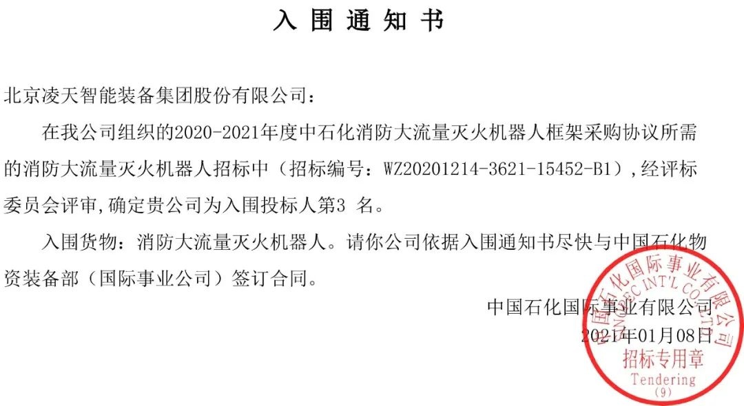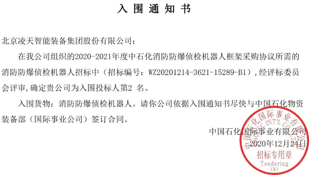 今日,從中石化天津國事了解到,北京凌天消防機器人全部中標入圍中石化框架采購目錄。