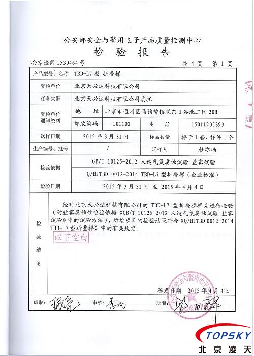 此款折疊梯是由鋁合金材料制成的,連接銷為不銹鋼,操作極為簡便且使用安全可靠。相比于傳統的梯子,它的主要特點是重量輕,折疊后體積小,可以放在一個小箱子內,攜帶方便,適用于處理各種緊急情況;例如人質救援,包圍犯罪分子,也可以用于水上救援時做跳板用。 本產品通過公安部安全與電子產品檢測檢驗中心檢測,檢測報告編號:公京檢第1530464號。