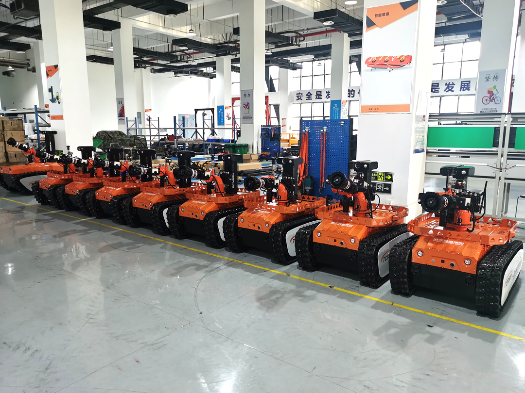 1300底盤主要是用來搭載其它智能裝備,如機械臂、云臺、消防炮等,底盤采用履帶結構,采用前后4擺臂+履帶的結構形式,履帶和擺臂適合復雜地形,可以提高越障性能。可工作于惡劣環境當中,能適應各種地形快速作戰部署。