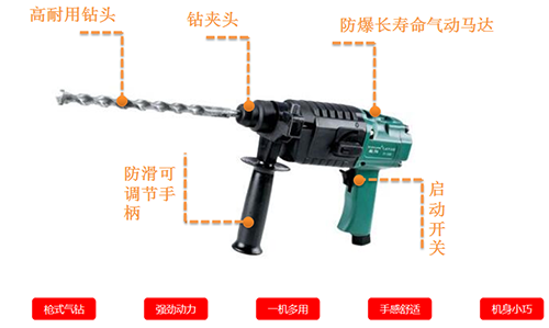 主要用于巖石,磚墻,混凝土等構(gòu)件上鑿孔,作安裝管道、架設(shè)動(dòng)力線路、安裝地腳螺栓、化工廠、精煉廠、建筑、重工業(yè)、危險(xiǎn)潮濕的隧道、水下及狹窄的空間作業(yè);尤其在高瓦斯防爆礦井中,氣動(dòng)防爆無火花更能體現(xiàn)安全性。它是提高工效,減輕勞動(dòng)強(qiáng)度的工具.