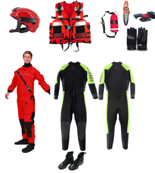 由水域救援頭盔、水域救援手套、水域救援靴、激流救生衣、特級干式/濕式救援服,大音量救生口哨、水域救生刀、多用途信號燈、拋繩包等組成。