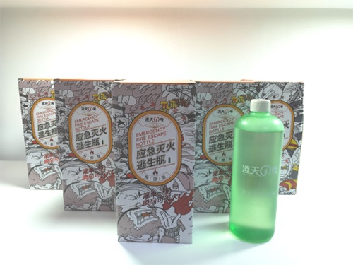 應(yīng)急逃生滅火瓶為滅火劑裝于環(huán)保可降解的特殊樹脂瓶中,只需投擲于火源中,滅火瓶觸碰到物體即可破碎,滅火劑會(huì)從破裂的瓶中瞬間散布出來(lái), 在燃燒物表面流散的同時(shí)液體冷卻其表面,并在燃燒物表面上形成一層水膜與泡沫層共同封閉燃燒物表面,隔絕空氣,形成隔熱屏障,吸收熱量后的液體汽化并稀釋燃燒物表面上空氣的含氧量,對(duì)燃燒物體產(chǎn)生窒息作用,阻止了燃燒的繼續(xù);同時(shí),該滅火劑與燃燒物質(zhì)發(fā)生化學(xué)反應(yīng),形成聚合物質(zhì),該聚合物質(zhì)能有效地抑制或降低燃燒自由基的產(chǎn)生,破壞燃燒鏈,阻止燃燒.