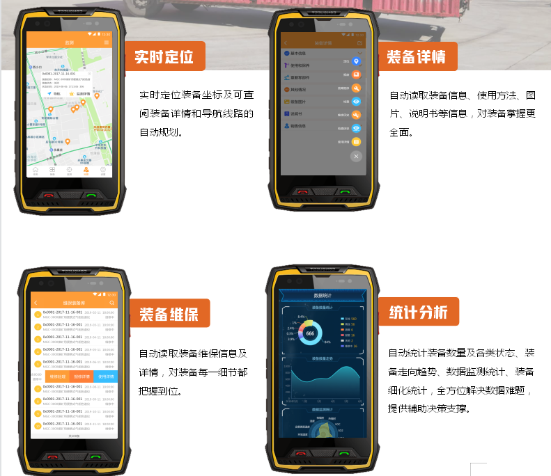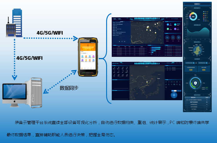 應(yīng)急消防裝備云管理平臺(tái)系統(tǒng)能夠直接通過職能人員手持的防爆終端,直接讀取系統(tǒng)內(nèi)所有的裝備、設(shè)備及具體的詳情、圖片、位置、傳輸?shù)臄?shù)據(jù),根據(jù)裝備具有特性進(jìn)行實(shí)時(shí)在線監(jiān)測,當(dāng)監(jiān)測到的數(shù)據(jù)超標(biāo)時(shí),實(shí)時(shí)進(jìn)行報(bào)警及查閱報(bào)警信息。該平臺(tái)系統(tǒng)能夠結(jié)合智能防爆終端本身功能、北斗定位/GPS定位、錄像、拍照等進(jìn)行信息存儲(chǔ),隨時(shí)隨地查閱裝備庫、維修庫、報(bào)廢庫等級(jí)占比利用率分析,最終進(jìn)行數(shù)據(jù)統(tǒng)計(jì)分析處理。此外該系統(tǒng)支持本地化業(yè)務(wù)拓展,如:現(xiàn)場監(jiān)控、無線打印,保障此平臺(tái)系統(tǒng)在不同環(huán)境中的應(yīng)用與融合。